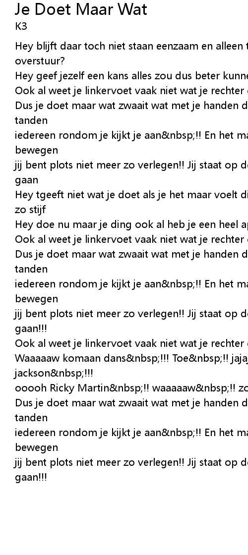 | Hey tgeeft niet wat je doet als je het maar voelt diep in je lijf doe toch niet zo stijf | |