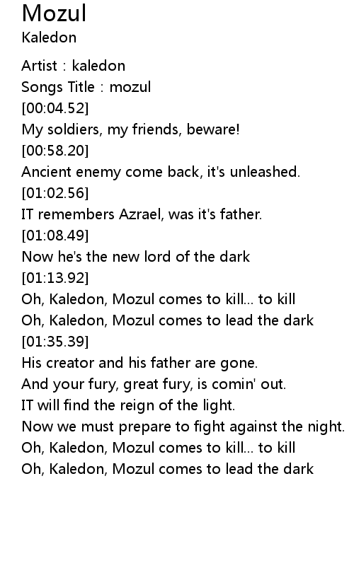 | [01:58.05] | Oh, Kaledon, Mozul comes to kill... to kill |