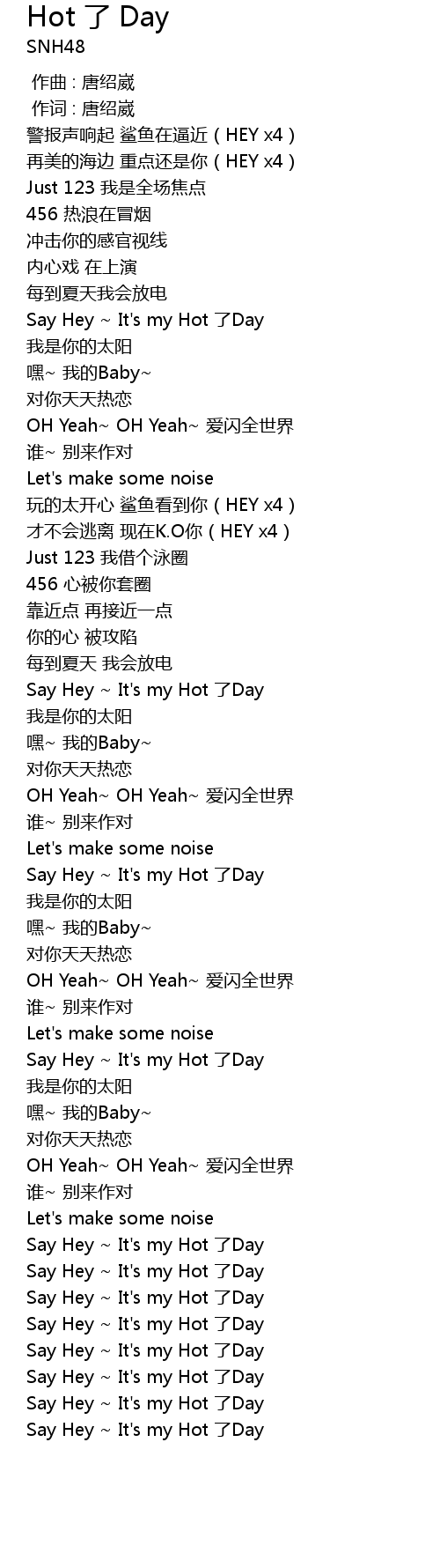 | [00:45.52] | Say Hey ~ It's my Hot 了Day |