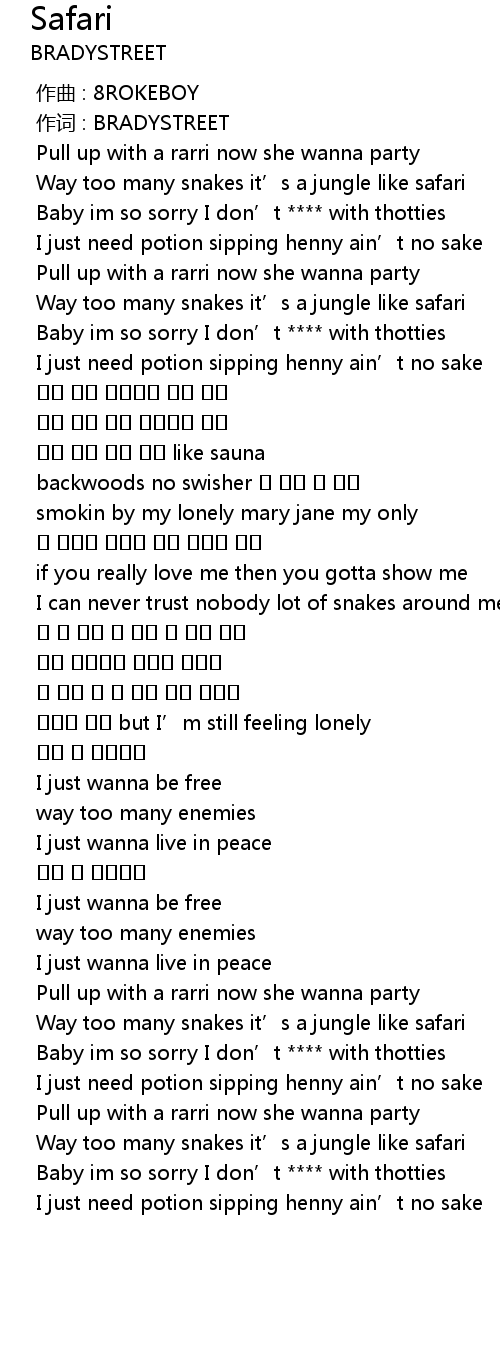 | [01:24.482] | Way too many snakes it' s a jungle like safari |