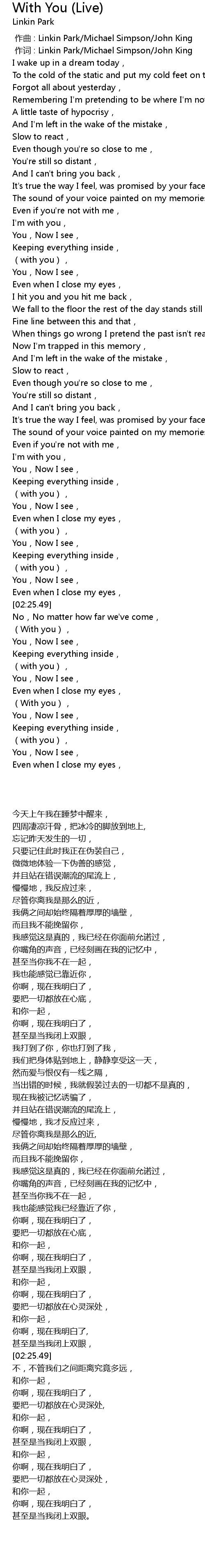 | [00:01.00] | 作词 : Linkin Park/Michael Simpson/John King |