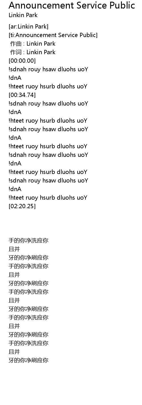 | [02:10.80] | !sdnah rouy hsaw dluohs uoY |