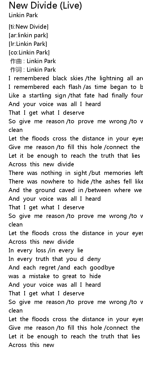 | [03:30.09] | Give me reason /to fill this hole /connect the space between |