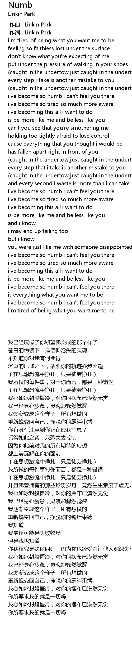 | [00:01.00] | 作词 : Linkin Park |