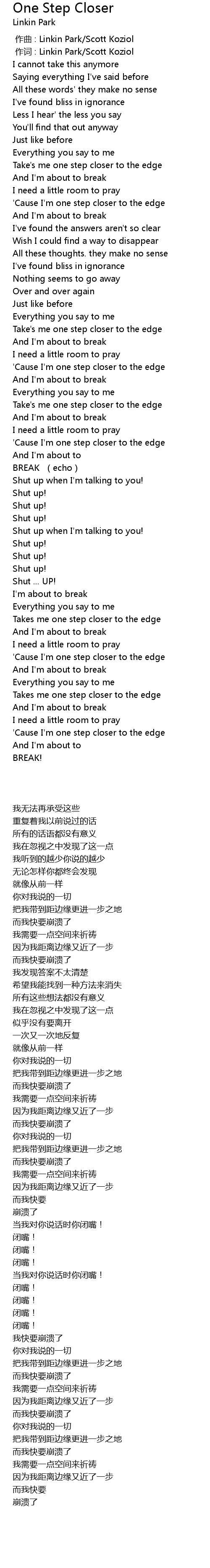 | [00:01.00] | 作词 : Linkin Park/Scott Koziol |