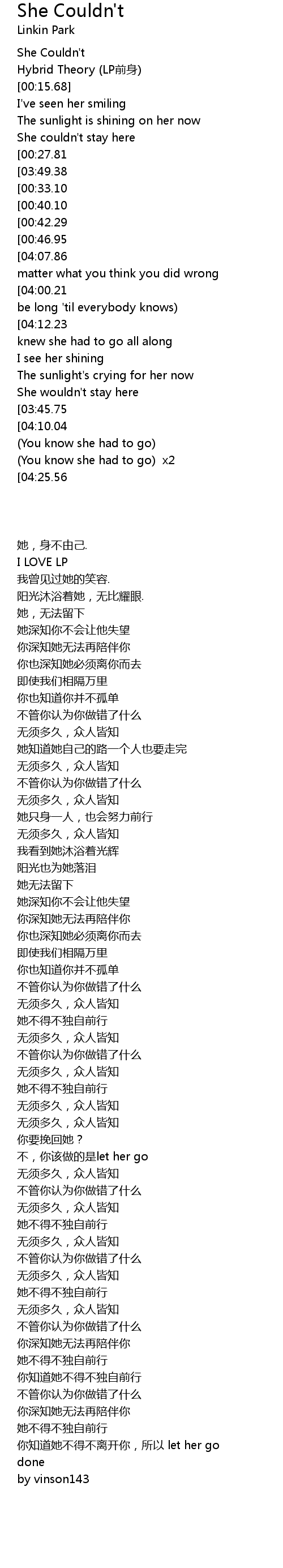 | [04:19.64][04:10.04] | (You know she couldn't stay here with you) |
