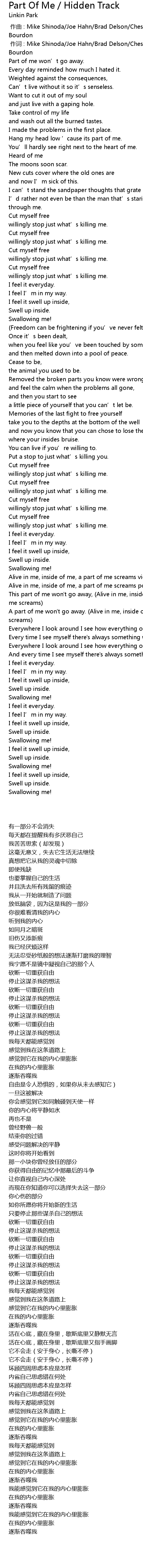 | [02:21.22] | A part of me won' t go away. Alive in me, inside of me, a part of me screams |