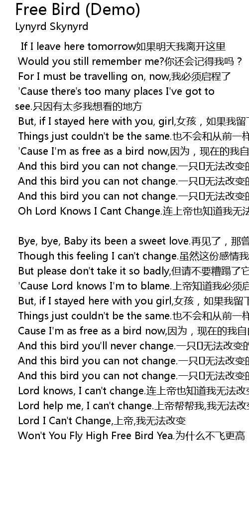 | Won' t You Fly High Free Bird Yea. wèi shí me bù fēi gèng gāo zì yóu niǎo |