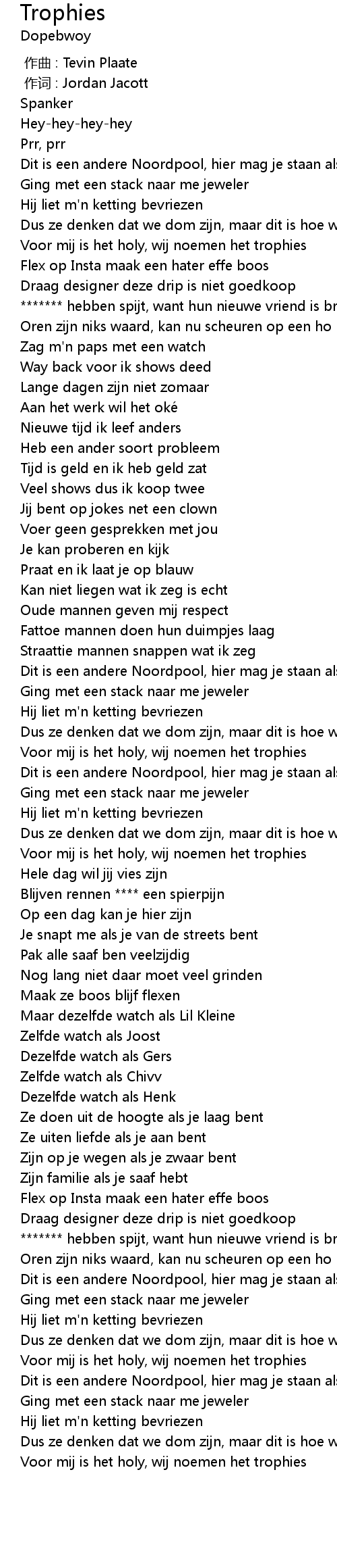| [00:22.36] | Voor mij is het holy, wij noemen het trophies |