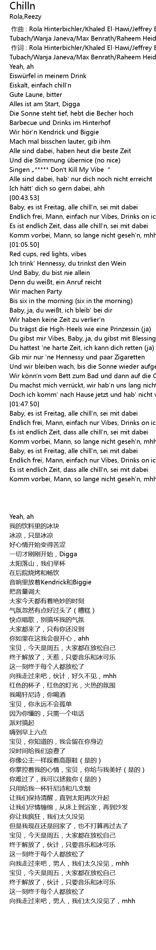 | [01:52.56] | Endlich frei, Mann, einfach nur Vibes, Drinks on ice |