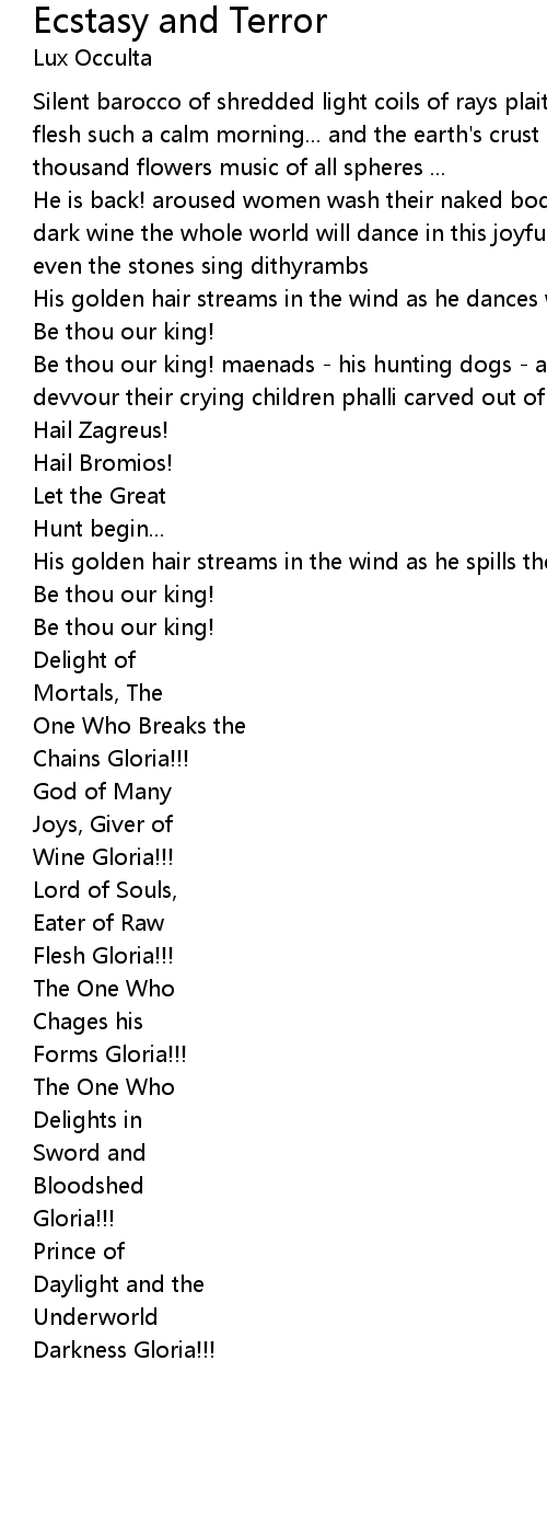 He is back! aroused women wash their naked bodies in bubbling springs of sweet dark wine the whole world will dance in this joyful time everything blossoms, even the stones sing dithyrambs |