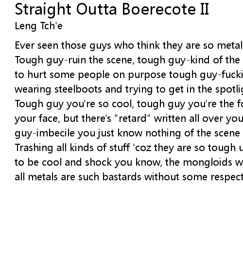 Trashing all kinds of stuff 'coz they are so tough using right-winged statements to be cool and shock you know, the mongloids who fuck up for us all people think all metals are such bastards without some respect |