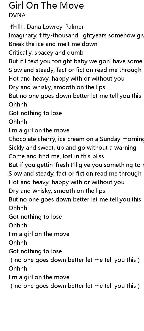 | [02:19.324] | I' m a girl on the move |