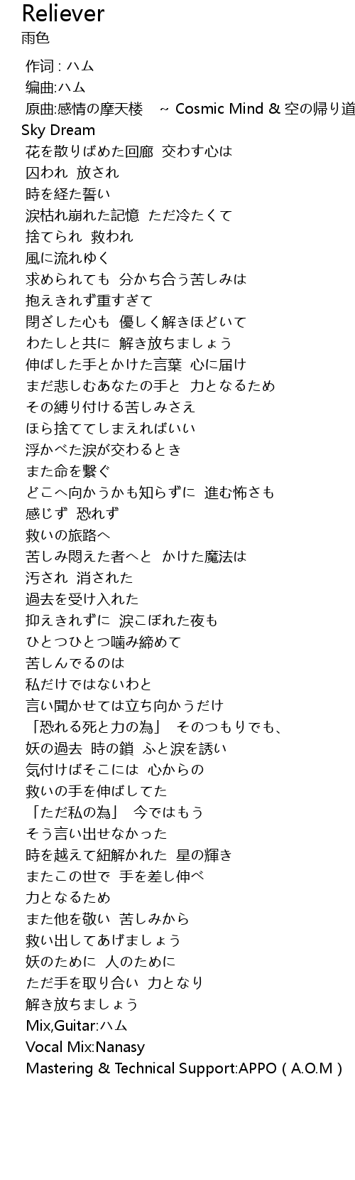 | [00:15.473] | 原曲:感情の摩天楼 ~ Cosmic Mind & 空の帰り道 ~ Sky Dream |