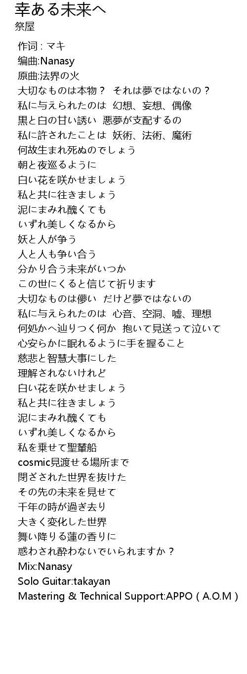 | [04:32.201] | Mastering & Technical Support:APPO(A.O.M) |