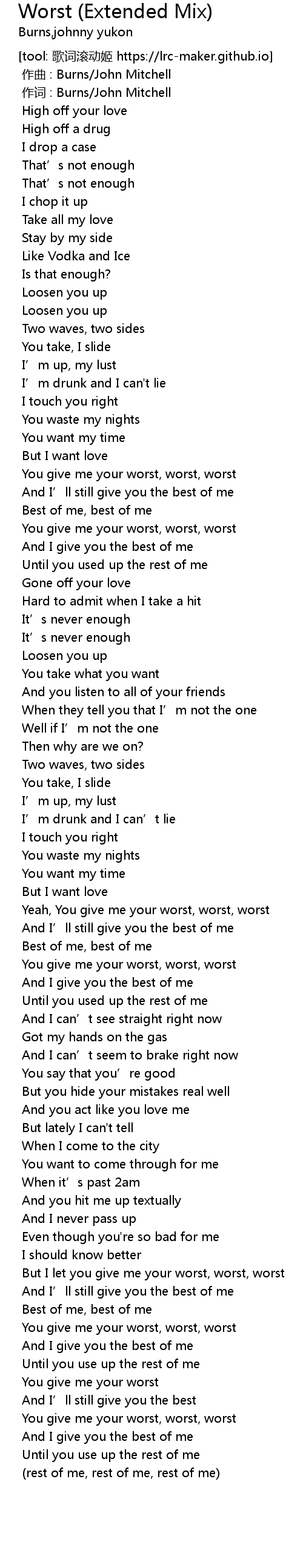 | [02:44.328] | But I let you give me your worst, worst, worst |