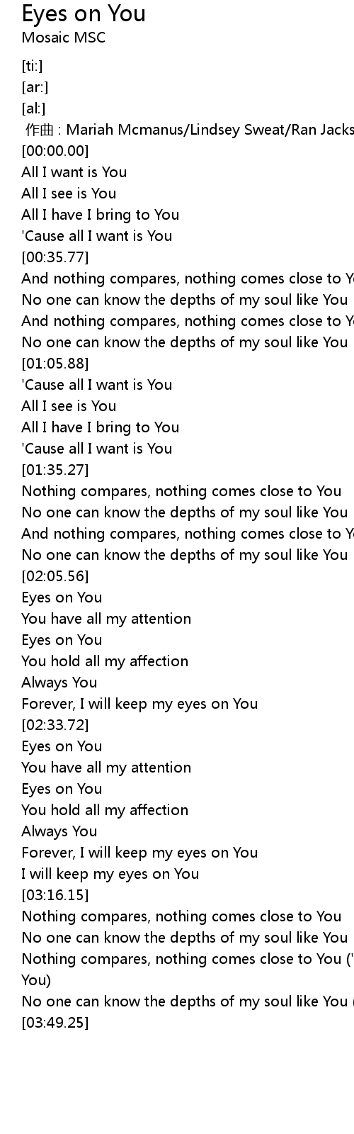 | [03:35.74] | Nothing compares, nothing comes close to You ' cause all I want is You |