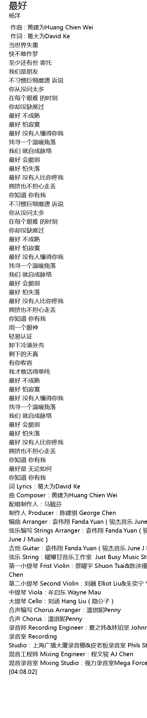 | [04:05.40] | 弦乐编写 Strings Arranger:袁伟翔 Fanda.Yuan(骏杰音乐 June J Music) |