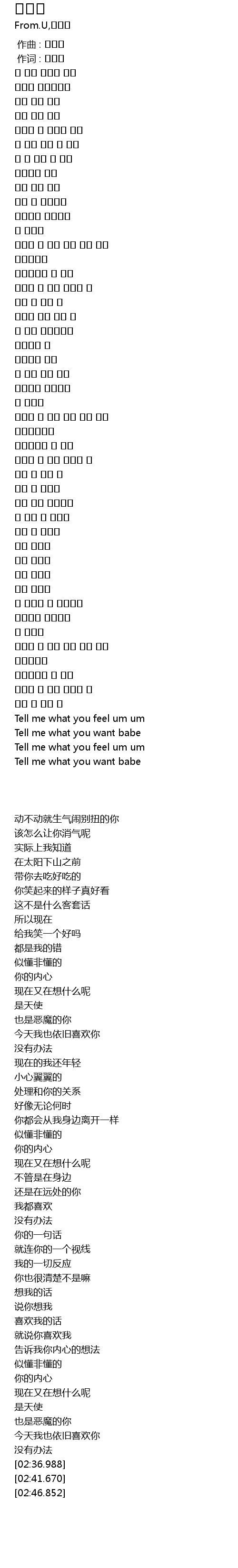 | [02:36.988] | Tell me what you feel um um |