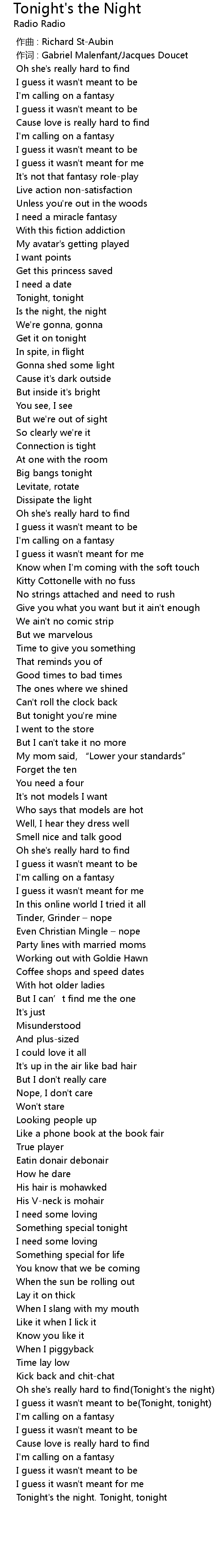 | [03:04.338] | Oh she's really hard to find(Tonight's the night) |