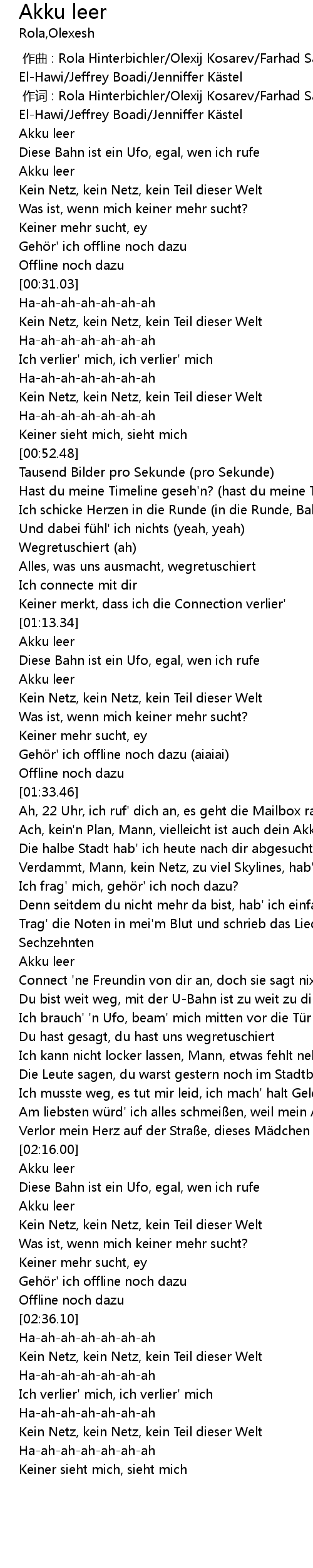 | [02:10.24] | Am liebsten würd' ich alles schmeißen, weil mein Akku leer ist |