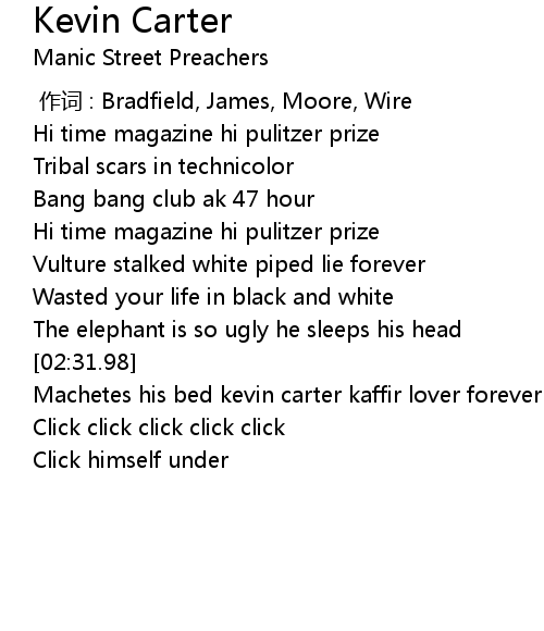 | [02:34.98] | Machetes his bed kevin carter kaffir lover forever |