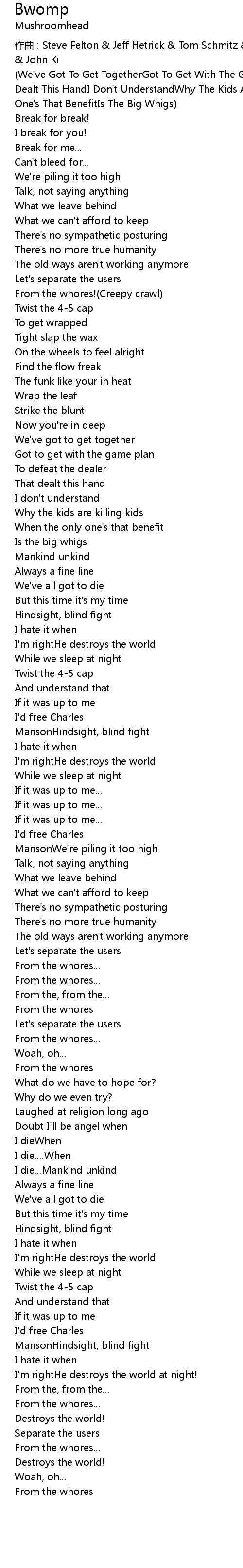 | We' ve Got To Get TogetherGot To Get With The Game planTo Defeat The DealerThat Dealt This HandI Don' t UnderstandWhy The Kids Are Killing KidsWhen The Only One' s That BenefitIs The Big Whigs | |