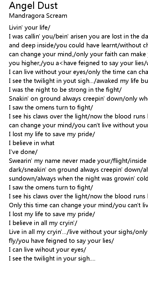 Swearin' my name never made your/flight/inside your life all is lost in the dark/sneakin' on ground always creepin' down/always afraid and fearin' for a sundown/always when the night was growin' cold/ |