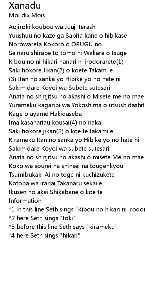 *1 in this line Seth sings "Kibou no hikari ni irodorarete"