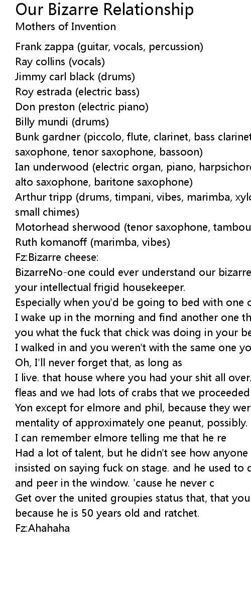BizarreNo-one could ever understand our bizarre relationship because that was your intellectual frigid housekeeper. |