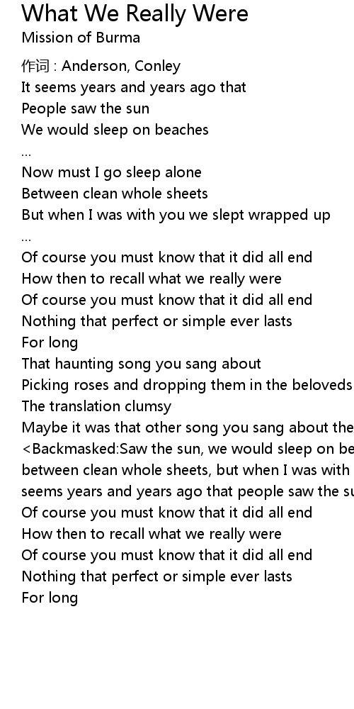 | Backmasked: Saw the sun, we would sleep on beaches... now must I go sleep alone between clean whole sheets, but when I was with you we slept wrapped up, it seems years and years ago that people saw the sun, we would sleep on beaches... | |
