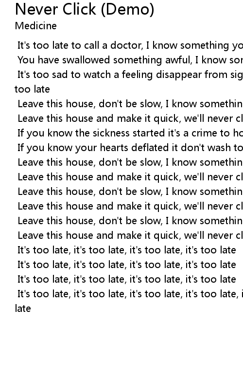 It's too late, it's too late, it's too late, it's too late, it's too late |