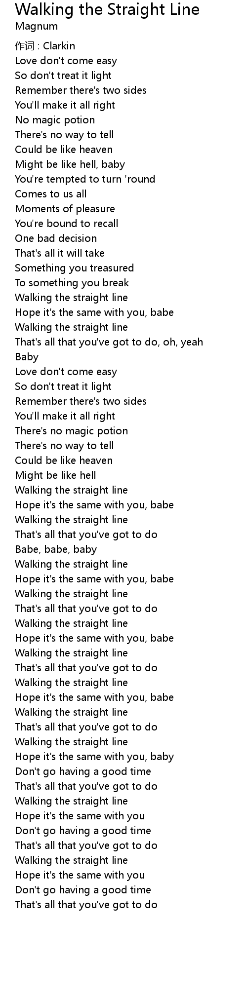 | Song | Walking the Straight Line |