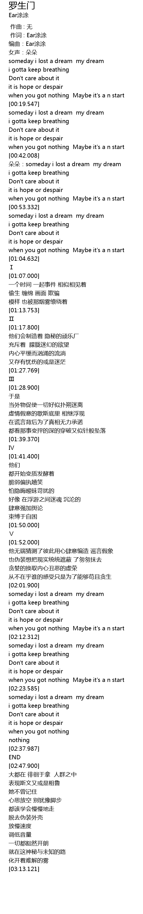 | [00:44.946] | duǒ duǒ: someday i lost a dream my dream |