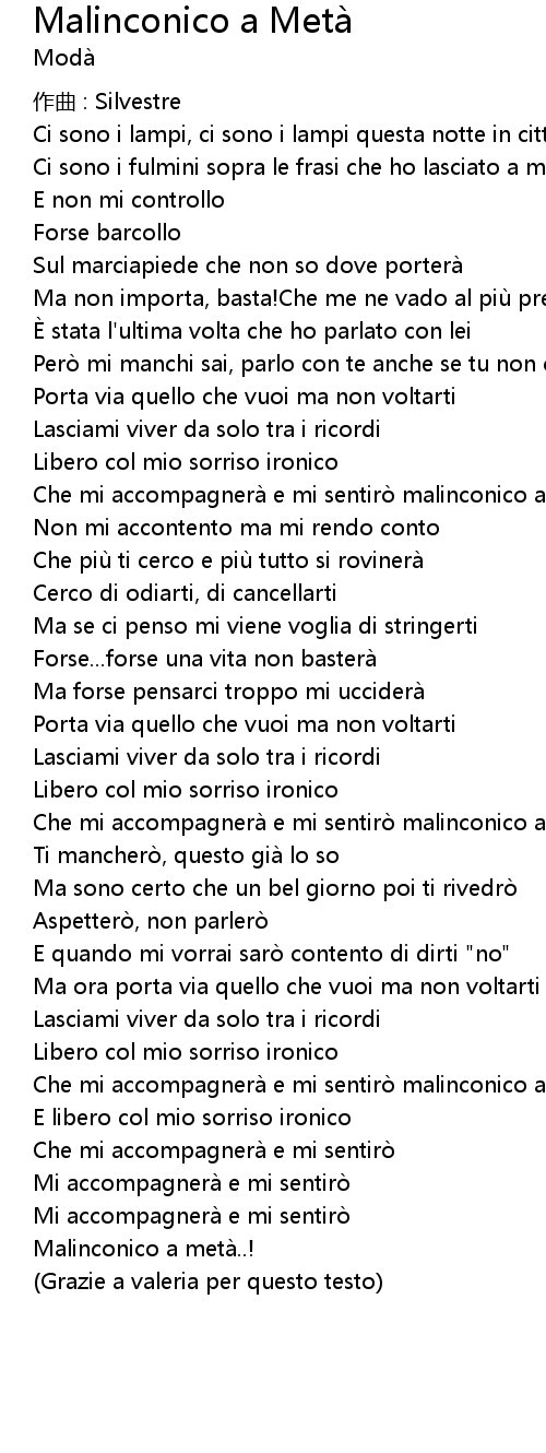| Che mi accompagnera e mi sentiro malinconico a meta, malinconico a meta | |