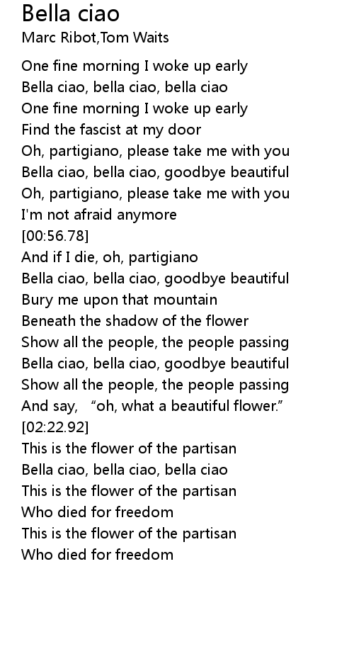 | [02:01.17] | Bella ciao, bella ciao, goodbye beautiful |