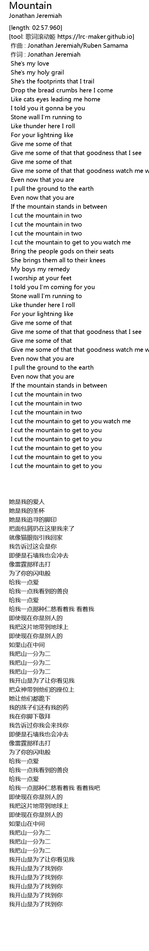 | [01:10.329] | I cut the mountain to get to you watch me |