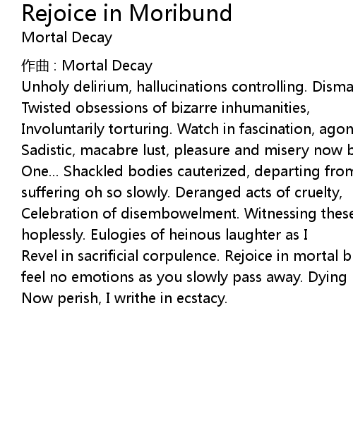 | Celebration of disembowelment. Witnessing these blank expressions as they wonder hoplessly. Eulogies of heinous laughter as I | |