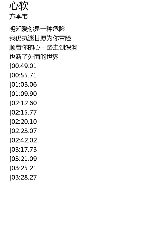 | [03:37.64][03:17.73][02:26.58] | 我一次一次对你心软 |