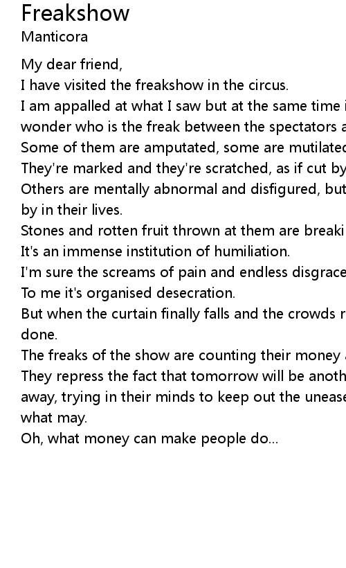 I am appalled at what I saw but at the same time it attracts me and makes me wonder who is the freak between the spectators and the sad souls performing. |