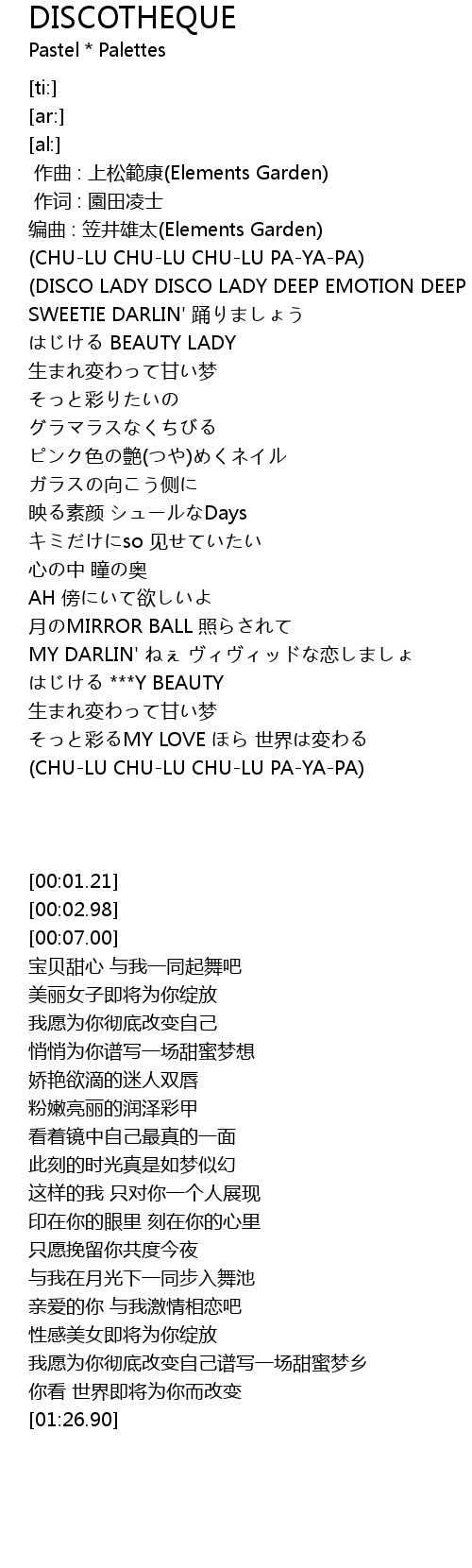 | [00:01.21] | 编曲 : 笠井雄太(Elements Garden) |