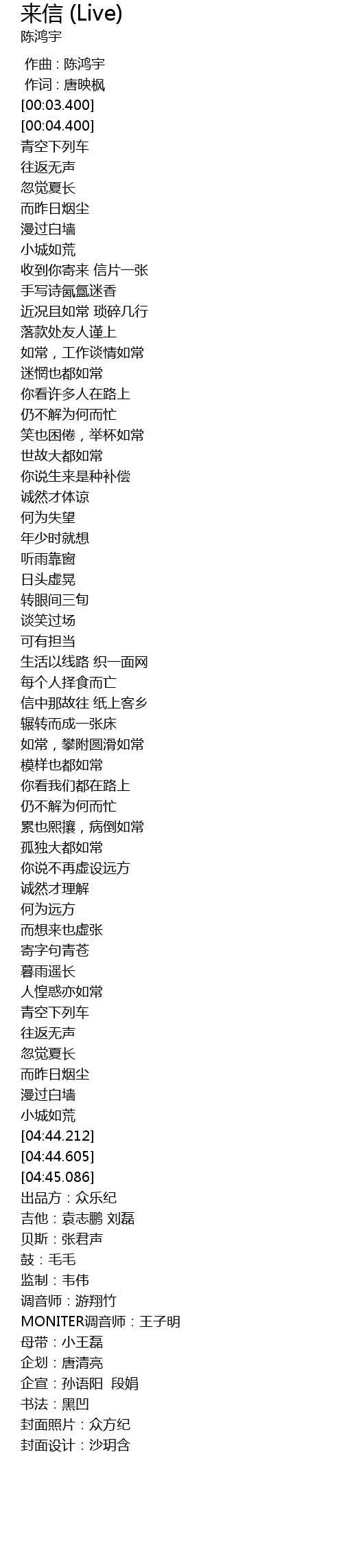 | [00:58.100] | 近况且如常 琐碎几行 |