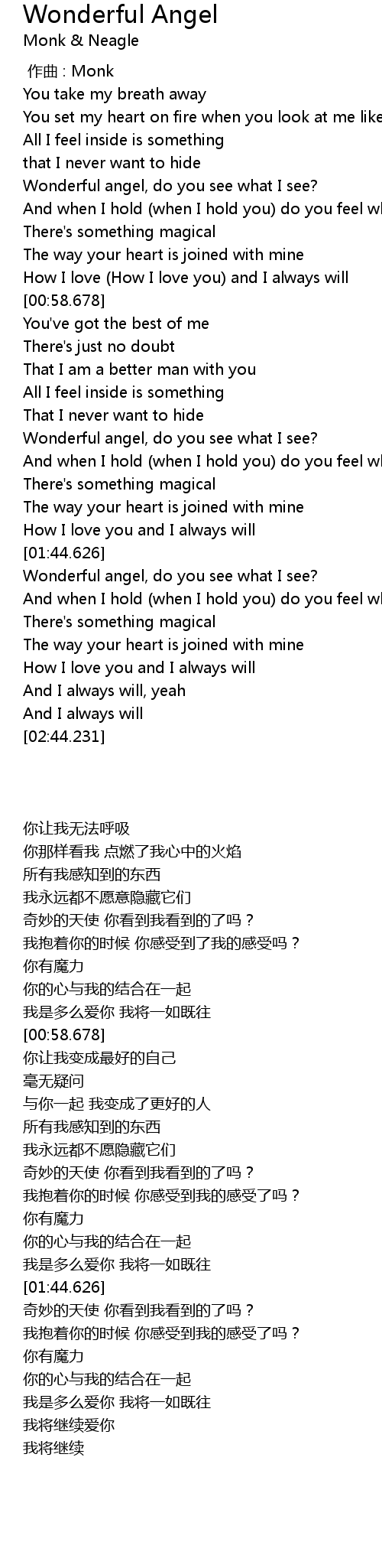 | [00:35.043] | Wonderful angel, do you see what I see? |
