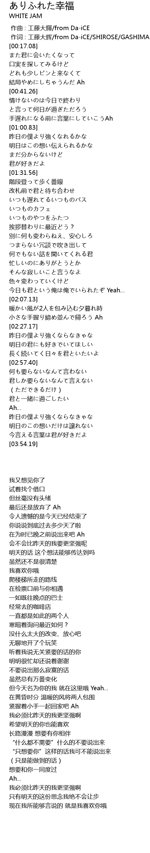 | [00:01.000] | 作词 : 工藤大辉/from Da-iCE/SHIROSE/GASHIMA |