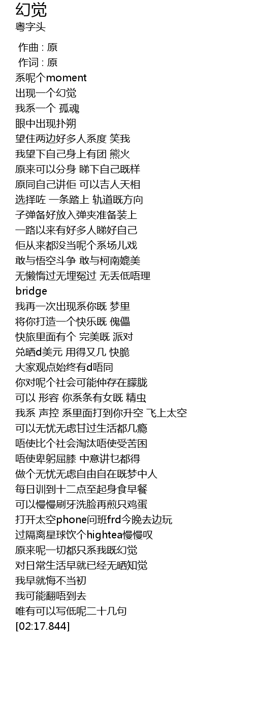 | [02:04.412] | 原来呢一切都只系我既幻觉 |