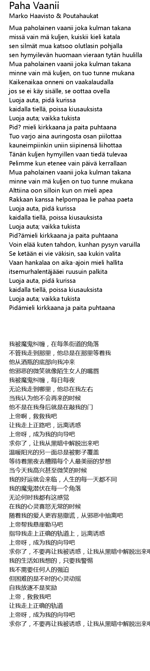 | [00:34.69] | Mua paholainen vaanii joka kulman takana |