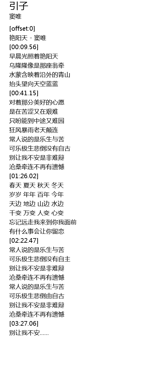 | [00:01.86] | 艳阳天 - 窦唯 |