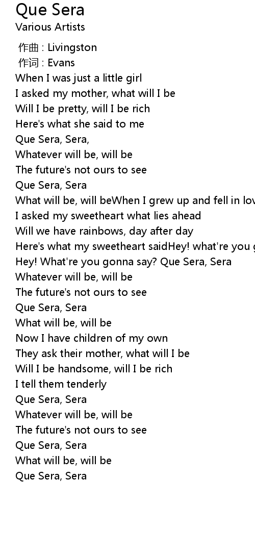 | [00:23.210] | Que Sera, Sera, |