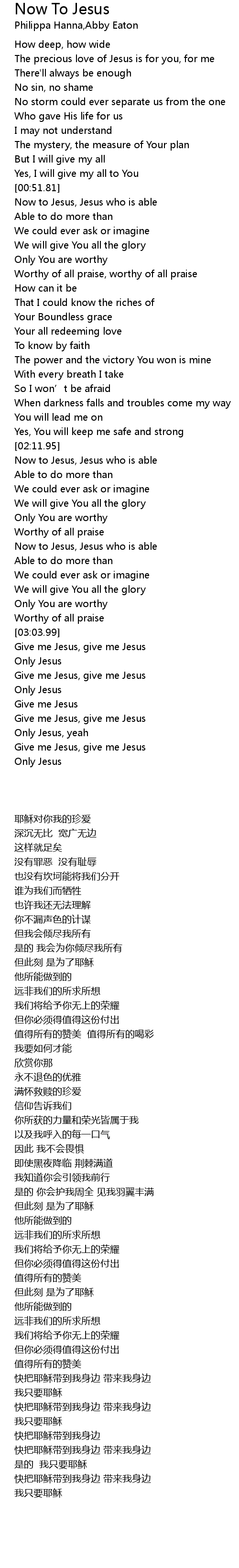 | [02:39.04] | Now to Jesus, Jesus who is able |