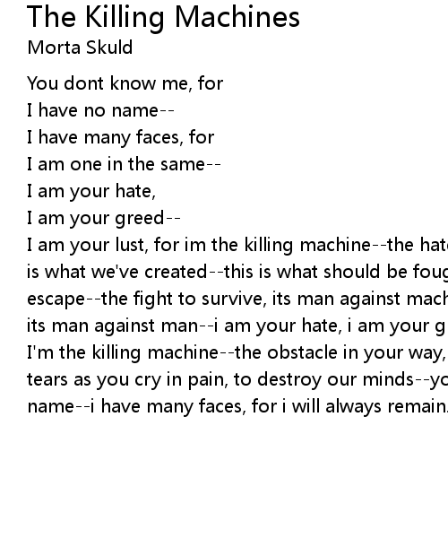 | I am your lust, for im the killing machine--the hate running through our hearts, is what we've created--this is what should be fought, not what should escape--the fight to survive, its man against machine--an assassin in the night, its man against man--i am your hate, i am your greed--i am your lust, for | |